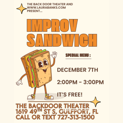 “Improv Sandwich” serves up an hour of laugh-out-loud fun with a wildly talented mix of performers playing fast-paced improv games—complete with audience participation! Join us for this FREE afternoon of comedy where we guarantee big laughs… or your money back. Wait, never mind, it’s free. Actually, tell you what: we’ll pay you a nickel to watch us! You’ll enjoy a playful lineup of improv games where the audience helps create the “who, what, and where” from suggestions provided by the audience. It’s spontaneous, silly, and seriously entertaining. Hope to see you there! Instructor: Laura Banks